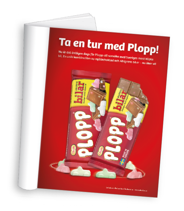 Ta fram en annons där jag på ett lekfullt sätt framhäver kombinationen Plopp och Ahlgrens bilar.