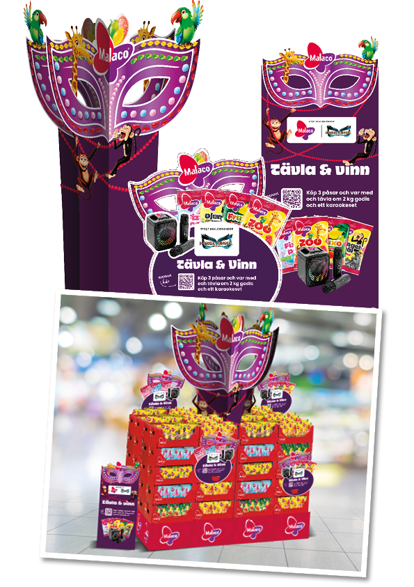 Designa och komma med förslag på butiksmaterial som uppfyller ovan krav. Ritade en mask som kopplar till Masked singer samtidigt som den byggs av godisbitar och figurer från Malaco Småpåsar. Den stora kryssexponeringen bygger stark synlinghet i butik och kompletteras sedan med skyltar och lamor som lyfter tävlingen.